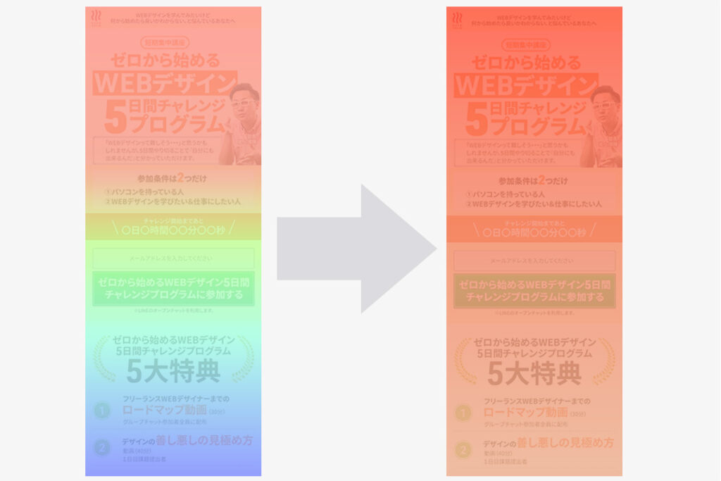 うみの手デザインではランディングページにこのヒートマップを導入し、定期的にモニタリング・デザイン調整を行うことで、より高い成果を得られるランディングーページへ改善を行っていきます。